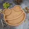 Tento dřevěný talířek ve tvaru žabky je ideální pro malé jedlíky, kteří si rádi hrají i při jídle. Je rozdělený na čtyři přihrádky – dvě oči a velký žabí úsměv – takže si děti mohou krásně rozdělit dobroty.