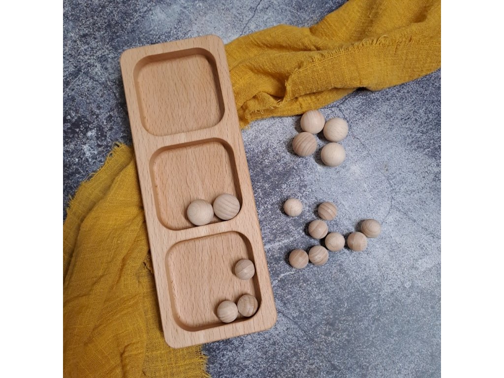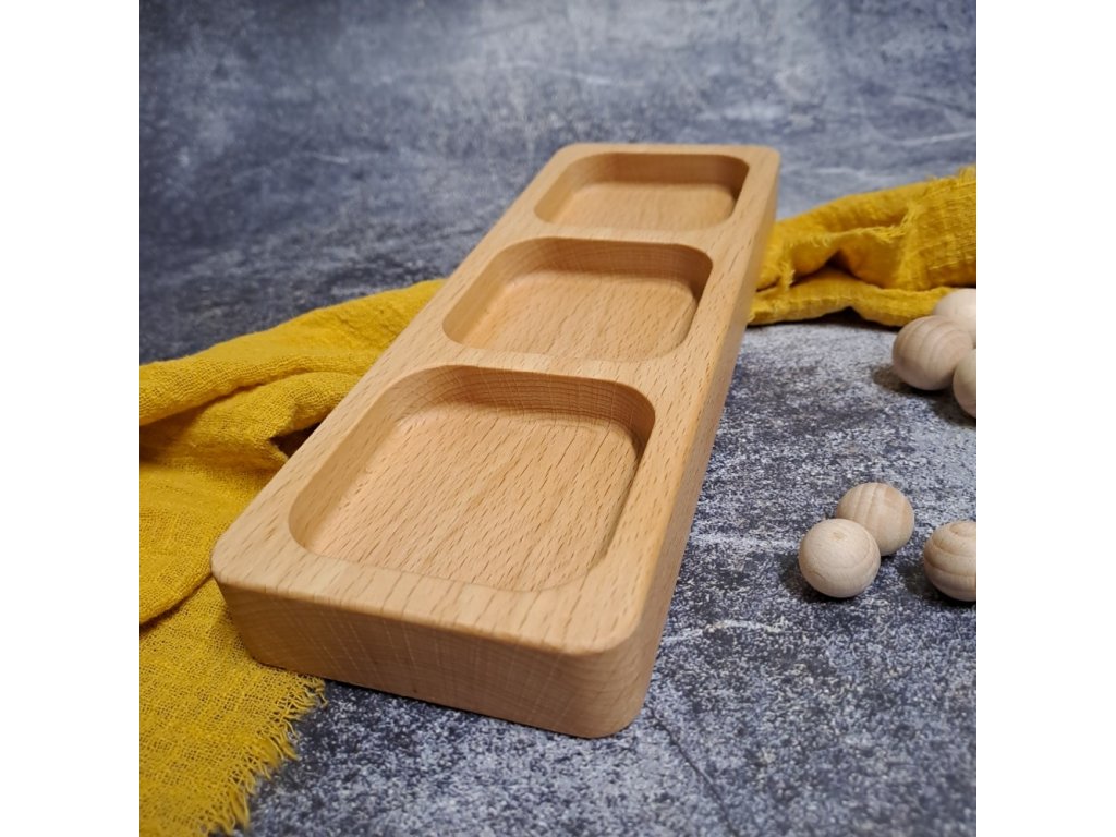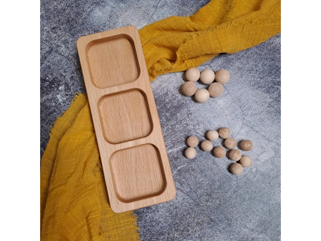Tento jednoduchý tác se třemi přihrádkami vznikl jako reakce na potřeby Montessori pedagogiky – přehlednost, jednoduchost a možnost samostatného objevování.